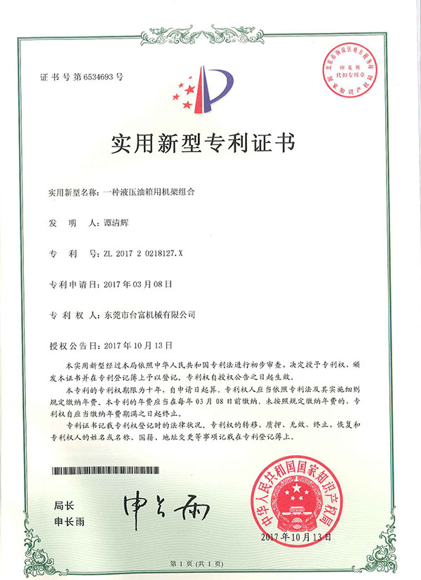 一種液壓油用機架組合專利證書